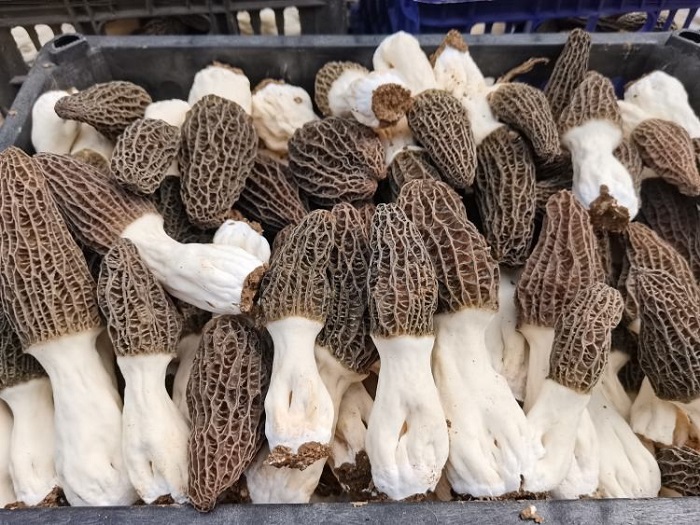 該基地占地25畝,初建有大棚27座。自去年11月播種以來,羊肚菌長勢良好,4月份已陸續開始出菇,種植戶們沉浸在羊肚菌收獲的喜悅之中,大棚內一朵朵羊肚菌破土而出,乳白色的菌柄撐起蜂窩狀的菌蓋,煞是喜人。大家滿懷喜悅的采摘羊肚菌,去根、烘烤、挑選、打包,做著銷售前的準備,一片繁忙歡快的景象。